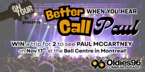 We are giving our listeners a chance to WIN a trip for 2 to see Paul McCartney’s “GOT BACK” Tour LIVE in Montreal at the Bell Centre on November 17th! All you have to do is listen for a song by Paul McCartney. When you hear it, call 506-847-9600 and be the correct caller through…